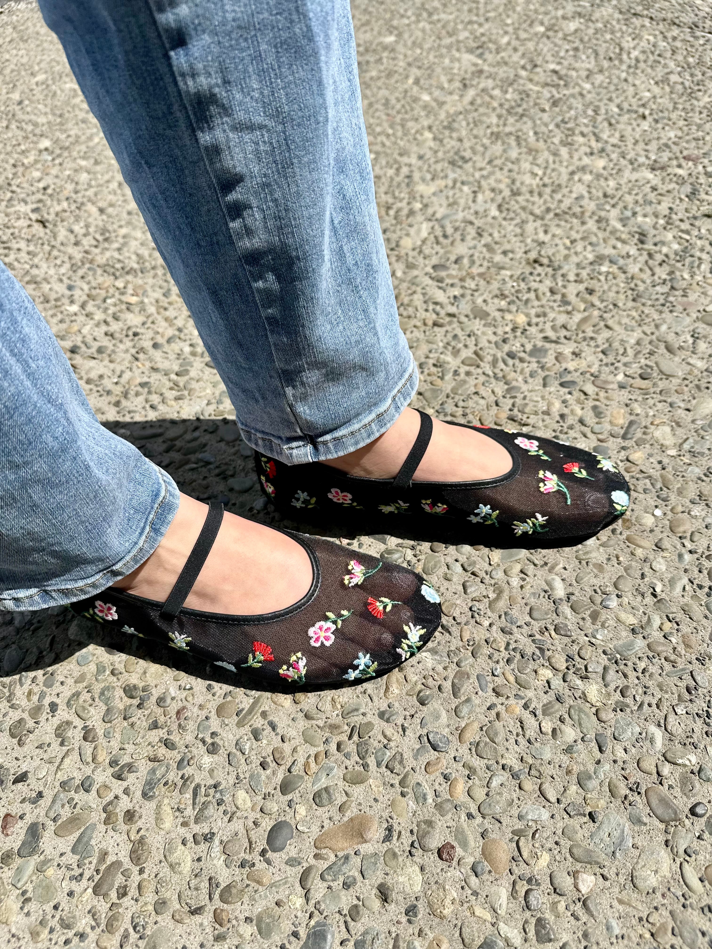 PREORDER- ETA 3-4 weeks from order.  Accommodates wide feet. The Elise Ballet Flat brings a romantic twist to everyday dressing. Crafted with soft mesh and delicate floral detailing, this flat offers breathable comfort with an elegant edge. Designed in a classic ballet silhouette with a flexible sole, it’s the perfect slip-on for both casual days and dressed-up moments. Floral mesh with embroidered detailing Classic ballet flat silhouette Lightweight, breathable, and versatile Cushioned sole for all-day wear