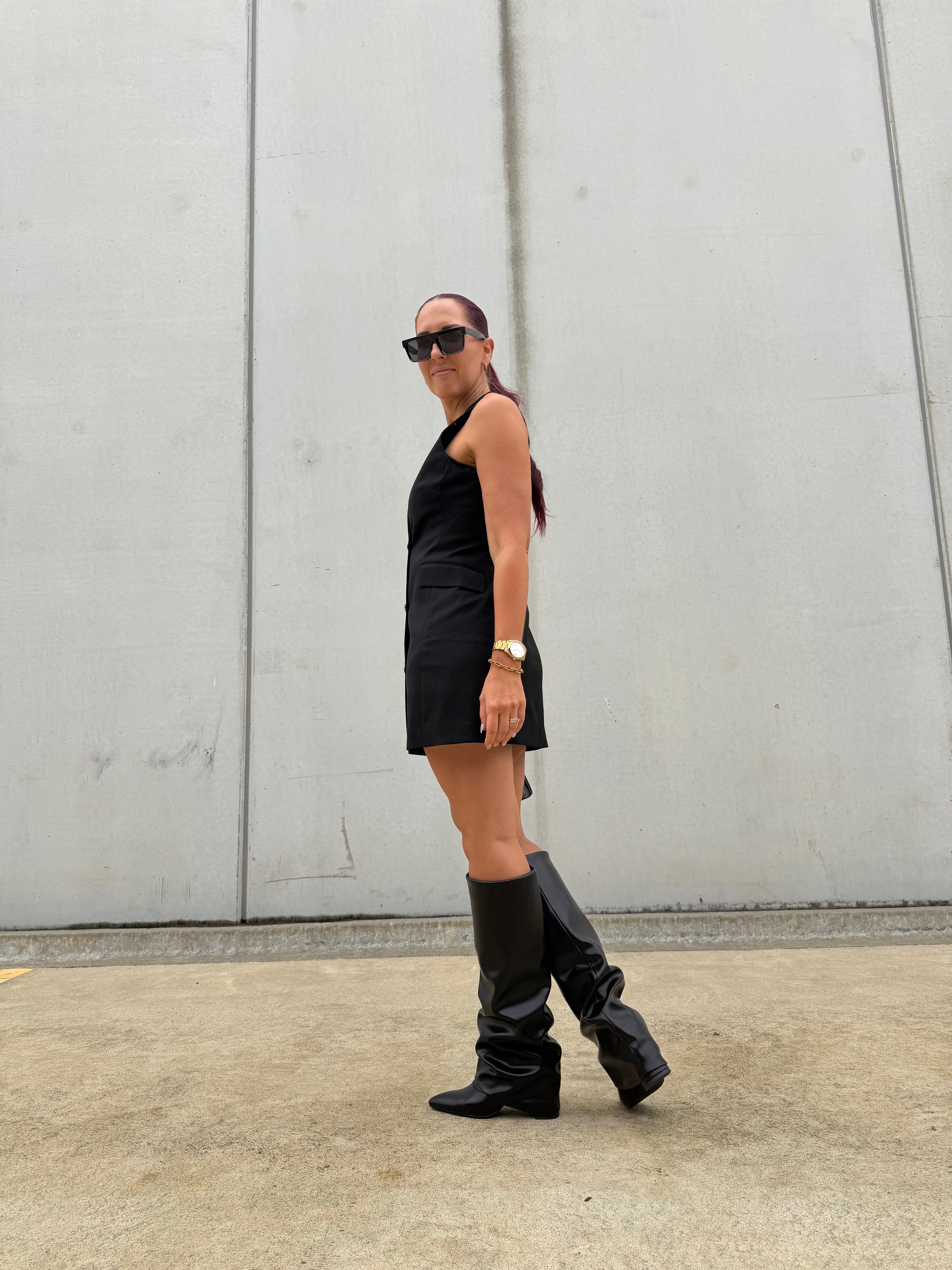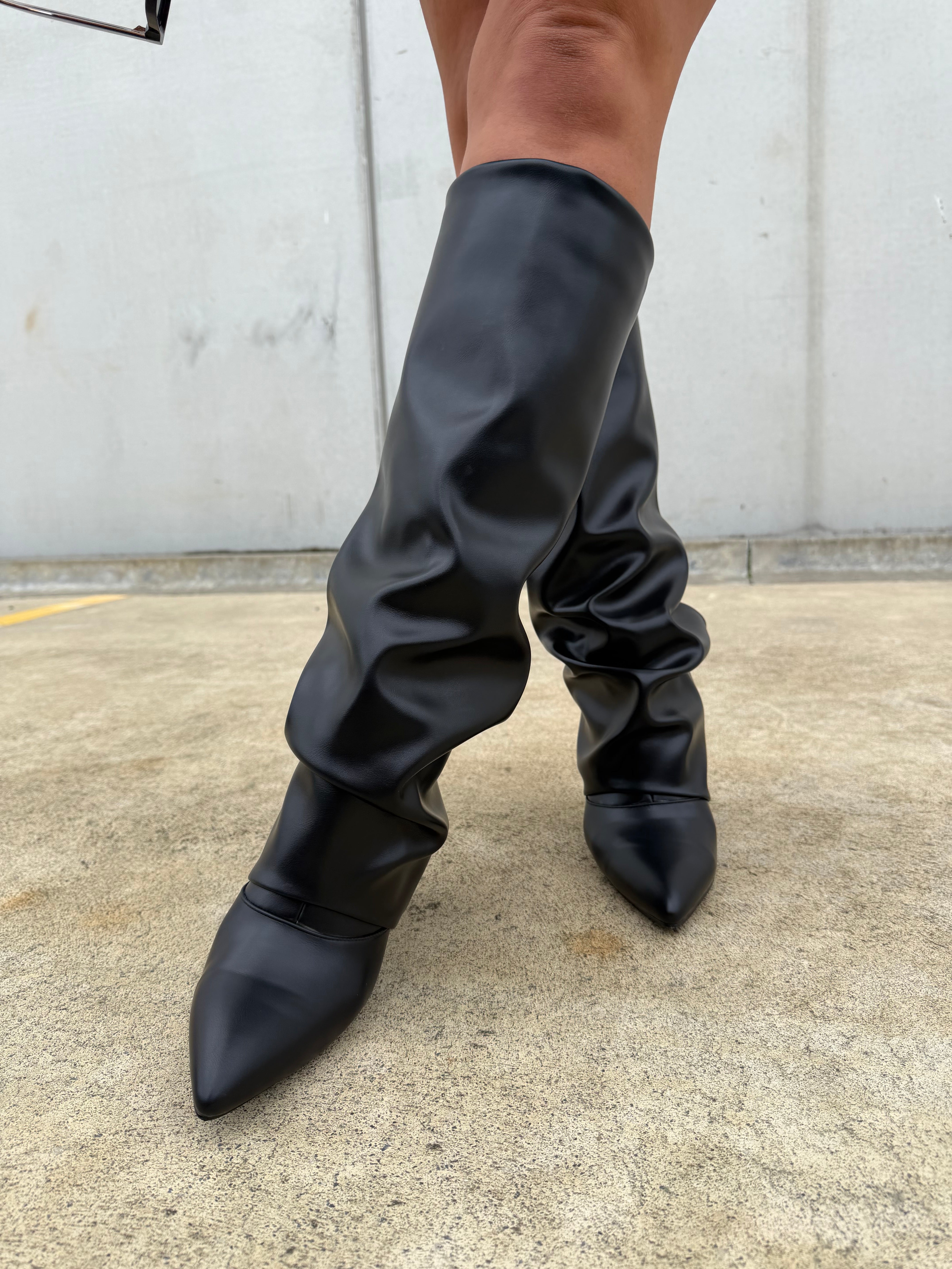PREORDER: As this style is a preorder release, orders will ship approximately 4 weeks from order. Don’t miss your chance to secure this season’s must-have boot. Please note preorders are not eligible for refunds. Accommodates wide feet. Calf Measurements: size 37 = 39cm size 38 = 39.5cm size 39 = 40cm size 40 = 40.5cm size 41 = 41cm size 42 = 41.5cm size 43 = 42cm. Crafted with a sleek silhouette and a versatile fold-over shaft, these block heel boots blend fashion and everyday comfort for year-round wear. Made from vegan leather, they offer a polished look without compromise. The...