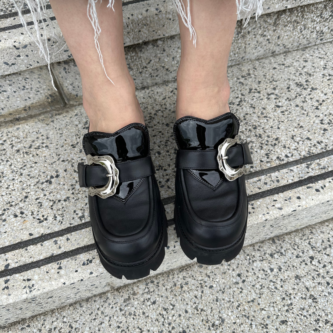 Accommodates wide feet. PREORDER- ETA 3 WEEKS FROM ORDER. Bold from every angle. The Ryder Mule is a statement slip-on built for comfort and edge. Designed with a chunky platform sole, oversized sculpted buckle, and finished with a high-gloss patent leather heart detail across the front, it's the kind of shoe that speaks for itself. Crafted in black leather and grounded with a lug sole for stability, it adds height without pressure and attitude without effort. Ryder brings edge and ease to your wardrobe. Whether styled with denim, tailored trousers or a coat-and-sock combo, this is the pair you’ll reach...