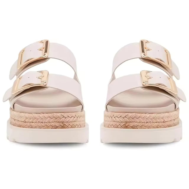 The Solea Slide is a modern take on effortless summer style. Featuring wide double straps finished with oversized gold buckles, this slide pairs laid-back ease with a touch of polish. The cushioned insole, espadrille-wrapped platform, and chunky sole bring comfort and height, perfect for elevating everyday outfits from denim to dresses.
